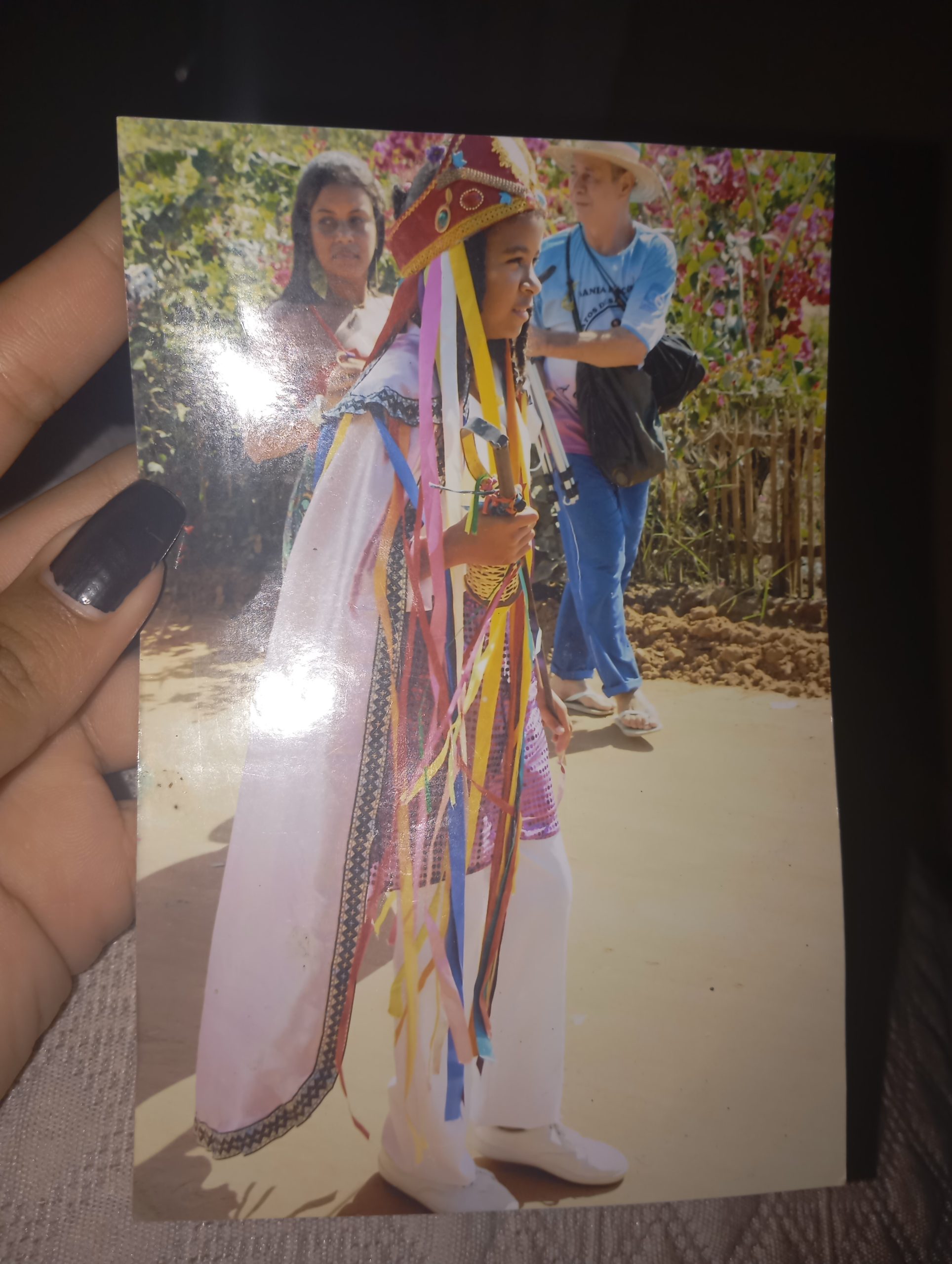 Com a farda de Corta VentoMarcellyoutubro 10, 2024Pessoas Marcelly, congadeira desde a infância, Fardada com a farda de Corta vento no 13 de maio de 2020, no Quilombo Córrego do Meio- Paula Cândido